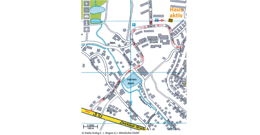 Seminarstraße - Dietzstraße – links ab in Richtung Griesbacher Hang / K.-Liebknecht-Straße – rechts ab in die Bruno-Dost-Straße bis Abzweig W.-Krodel-Straße – rechts ab und nach etwa 20 m rechts über den Anliegerparkplatz zum Haus aktiv (orangener Flachbau) - separate Parkplätze vor dem Haus aktiv vorhanden